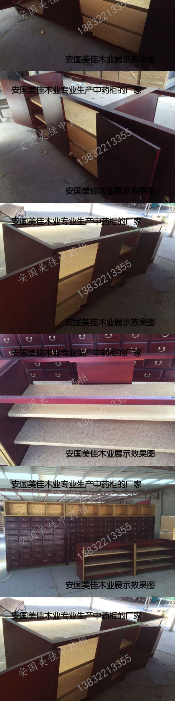 中藥柜展示臺用料---框架和抽屜選用優(yōu)質(zhì)樟松木,抽屜下面有五合板封底,防串味,抽屜底選用九厘板,中藥柜的后背兩側(cè)頂部選用五合板。