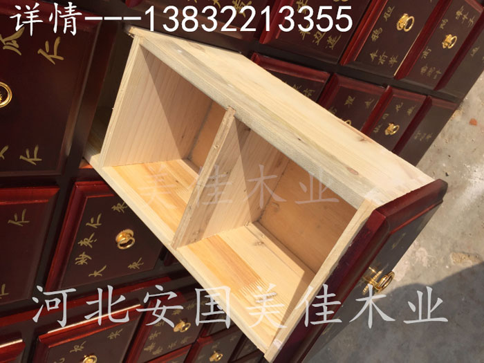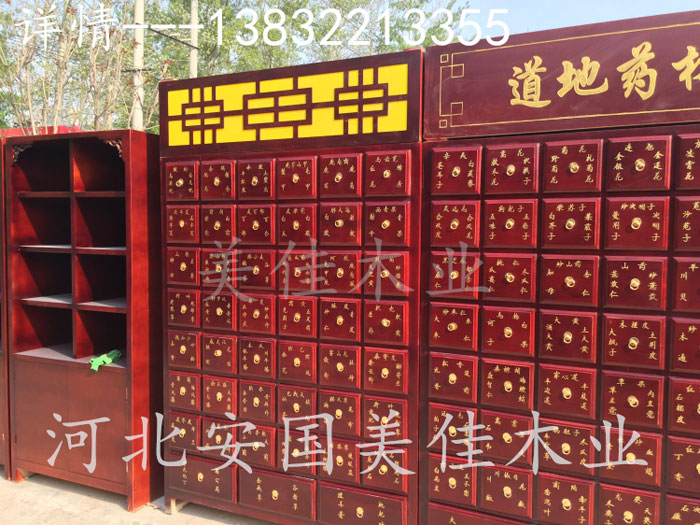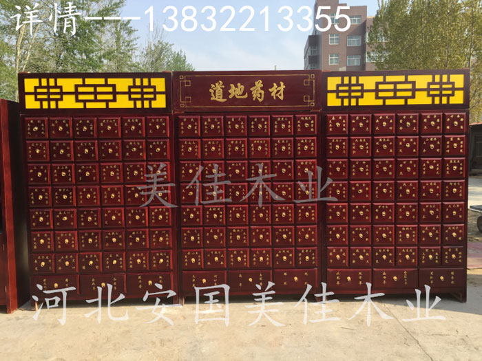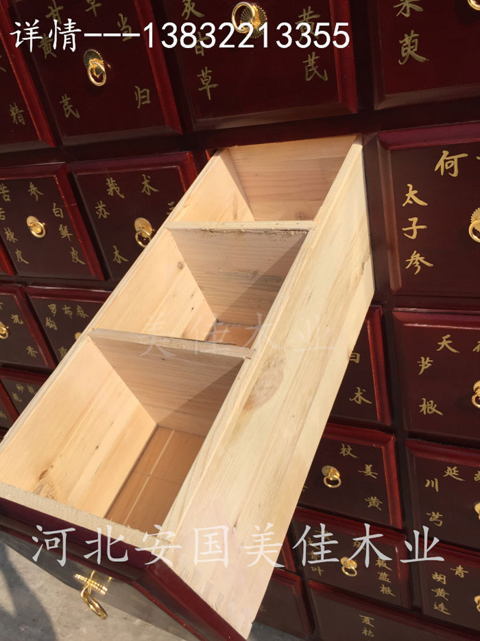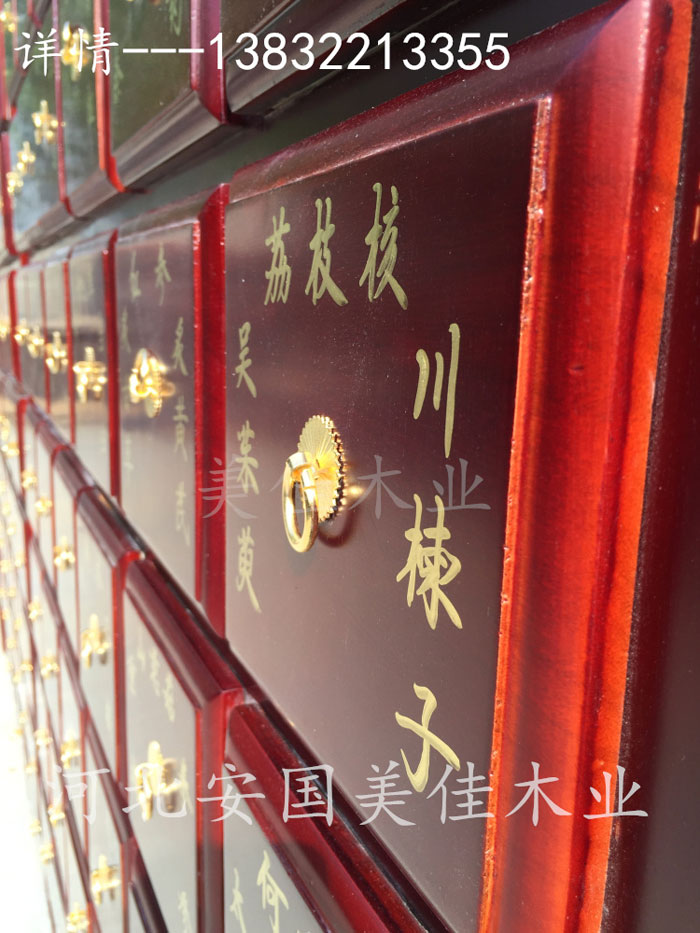 中藥柜尺寸---高220公分,寬150公分,厚60公分。抽屜面尺寸:寬18公分,高16公分。厚度18公分。中藥柜用料---框架和抽屜選用優質樟松木,抽屜下面有五合板封底,防串味,抽屜底選用七合板,中藥柜的后背兩側頂部選用七合板。中藥柜款式---橫六豎八款。橫著六個抽屜,豎著八層抽屜,較下面的三個大抽屜。根據客戶要求定做。中藥柜顏色---經典琥珀色花紋烤漆。燈箱外邊雕刻花型。中藥柜用漆---亮光或者半啞環保聚脂漆水房烤漆。中藥柜拉環---超精致純銅拉環。