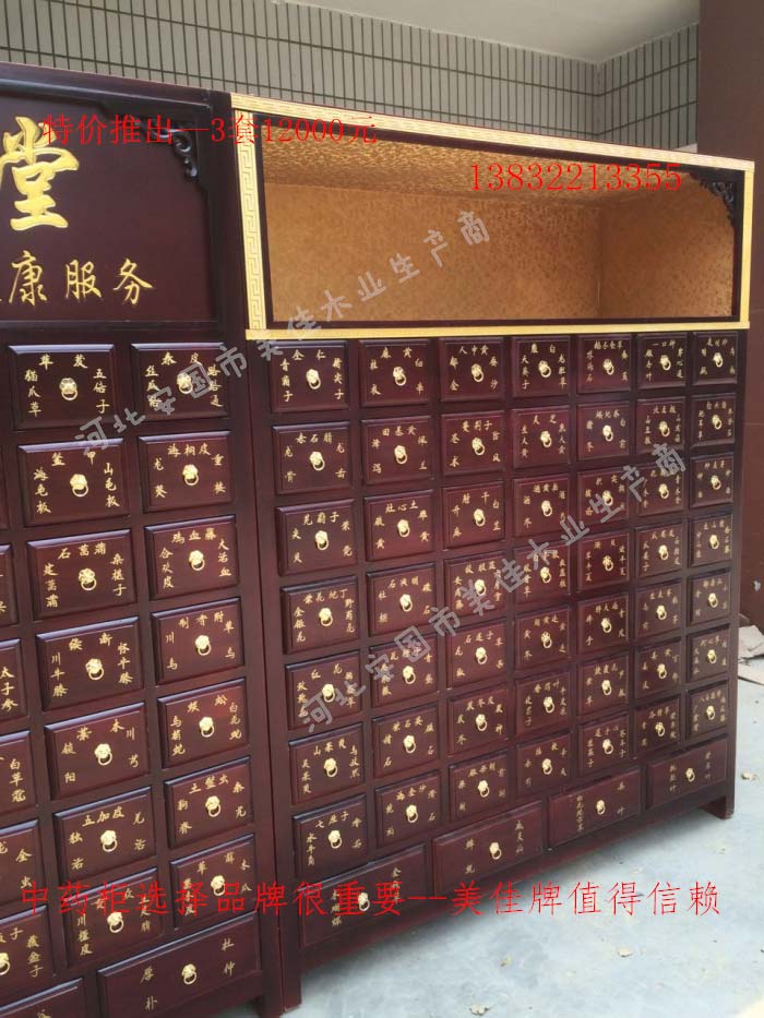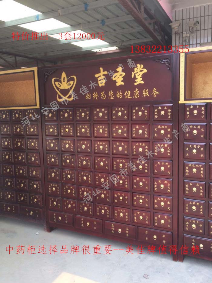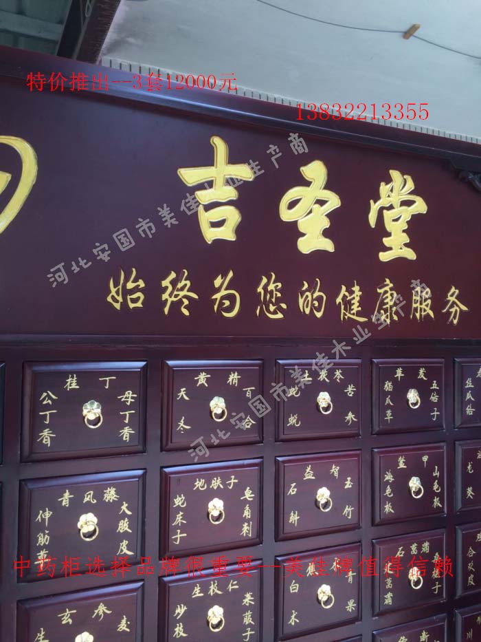 中藥柜尺寸---高215公分,寬170公分,厚60公分。抽屜面尺寸:寬18公分,高17公分。高度15公分。中藥柜用料---框架和抽屜選用優質樟松木,抽屜下面有五合板封底,防串味,抽屜底選用九厘板,中藥柜的后背兩側頂部選用五合板。中藥柜款式---橫七豎八款。橫著七個抽屜,豎著八層抽屜,較下面的四個大抽屜,每個抽屜兩味藥,每個中藥柜可以裝155味藥。中藥柜顏色---經典仿紅木色亮光花紋烤漆。中藥柜用漆---亮光或者半啞環保聚脂漆水房烤漆。中藥柜拉環---超精致純銅拉環。