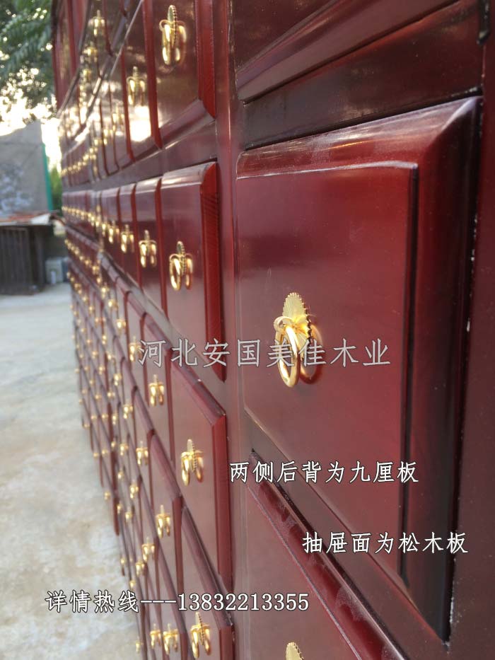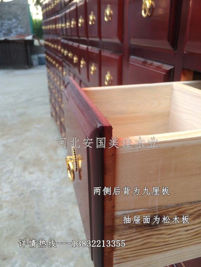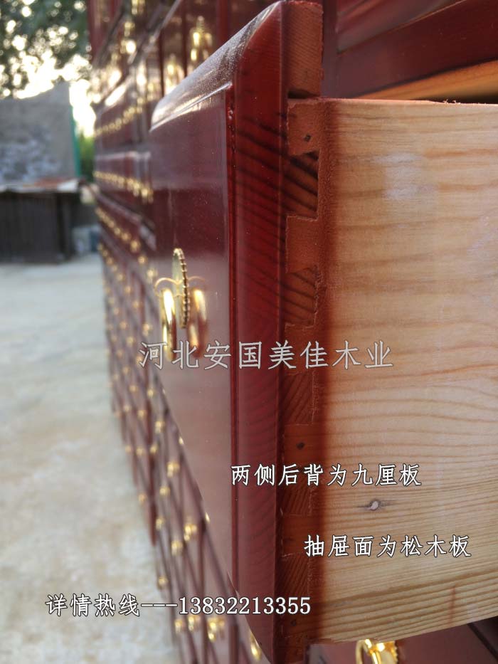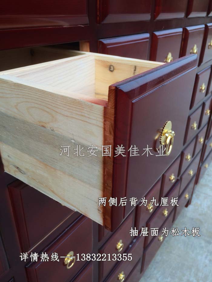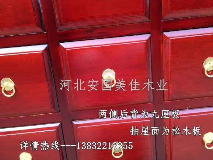 中藥柜尺寸---高240公分,寬170公分,厚60公分。抽屜面尺寸:寬18公分,高19公分。厚度17公分。中藥柜用料---框架和抽屜選用優質樟松木,抽屜下面有五合板封底,防串味,抽屜底選用七合板,中藥柜的后背兩側頂部選用九厘板。抽屜面為松木整塊板。中藥柜款式---橫七豎九款。橫著七個抽屜,豎著七層抽屜,較下面為兩排大抽屜,每個抽屜兩味藥,每個中藥柜可以裝163味藥。中藥柜顏色---經典仿紅木色花紋烤漆。中藥柜用漆---亮光或者半啞環保聚脂漆水房烤漆。中藥柜拉環---超精致純銅拉環。