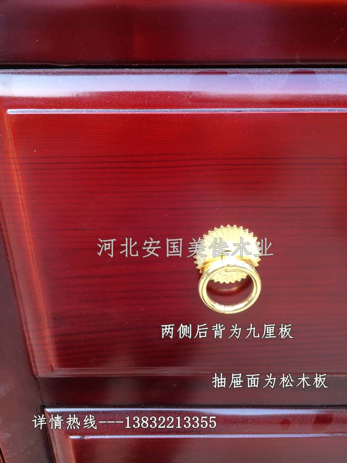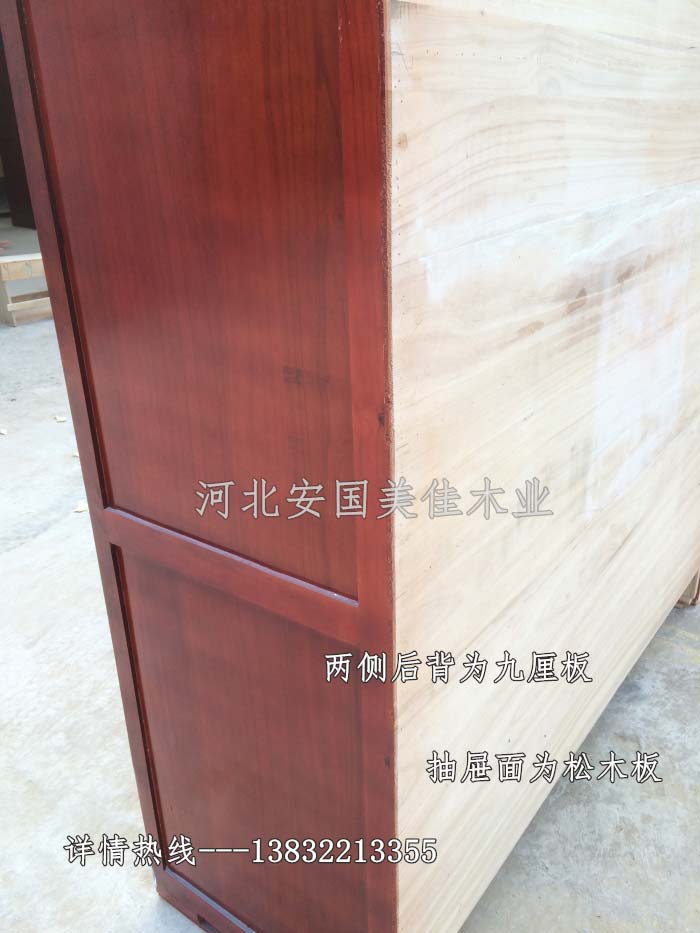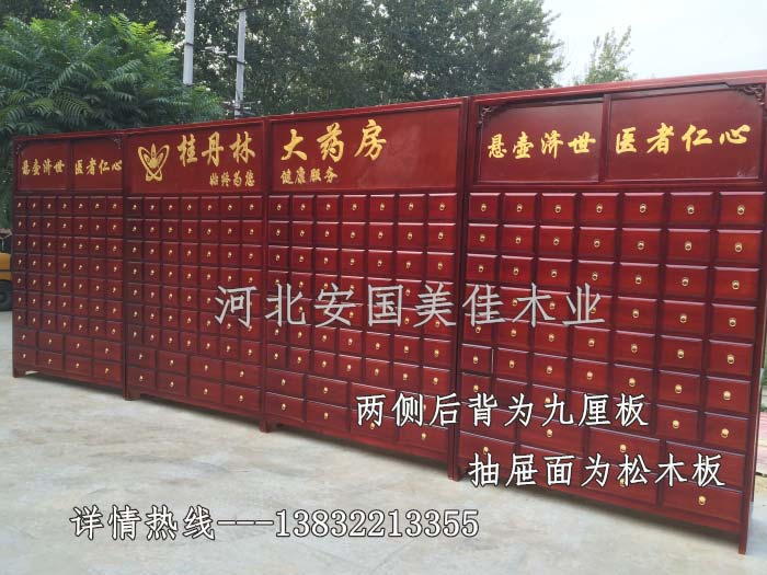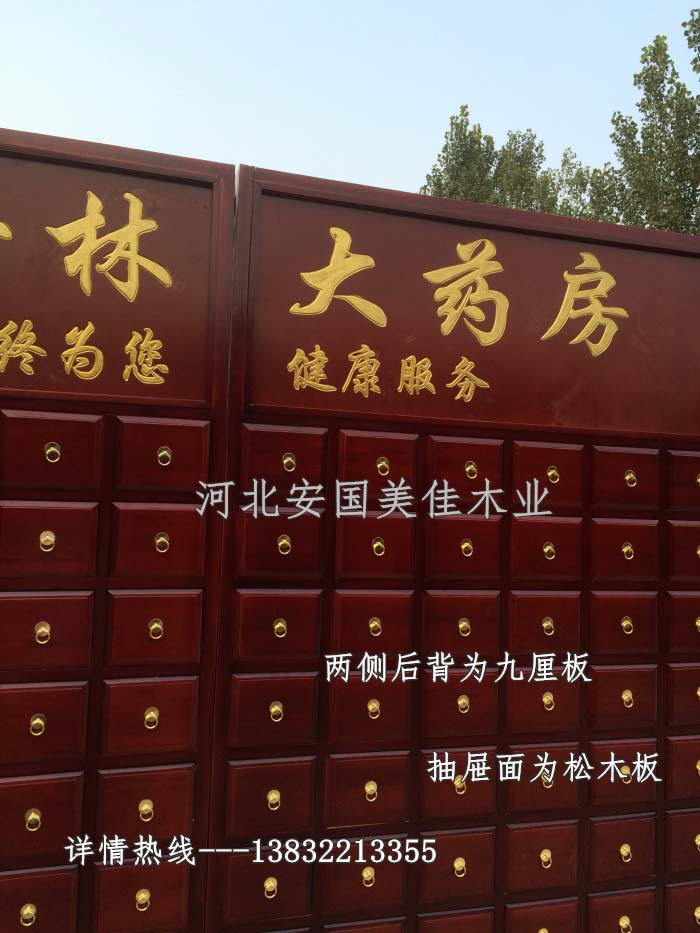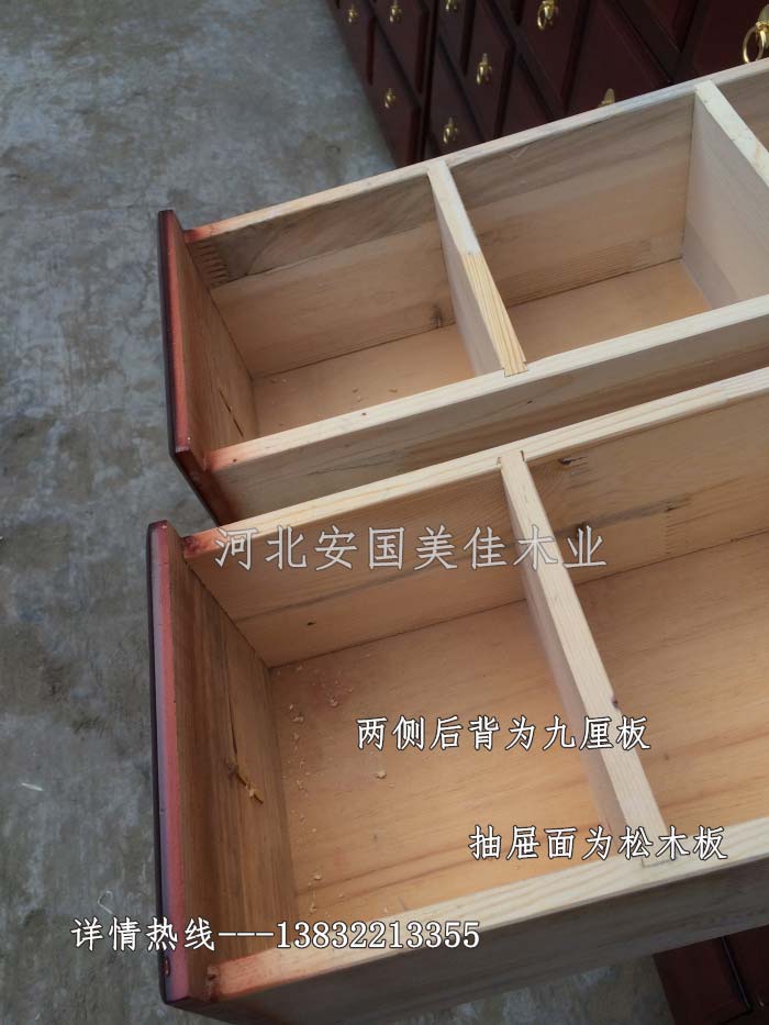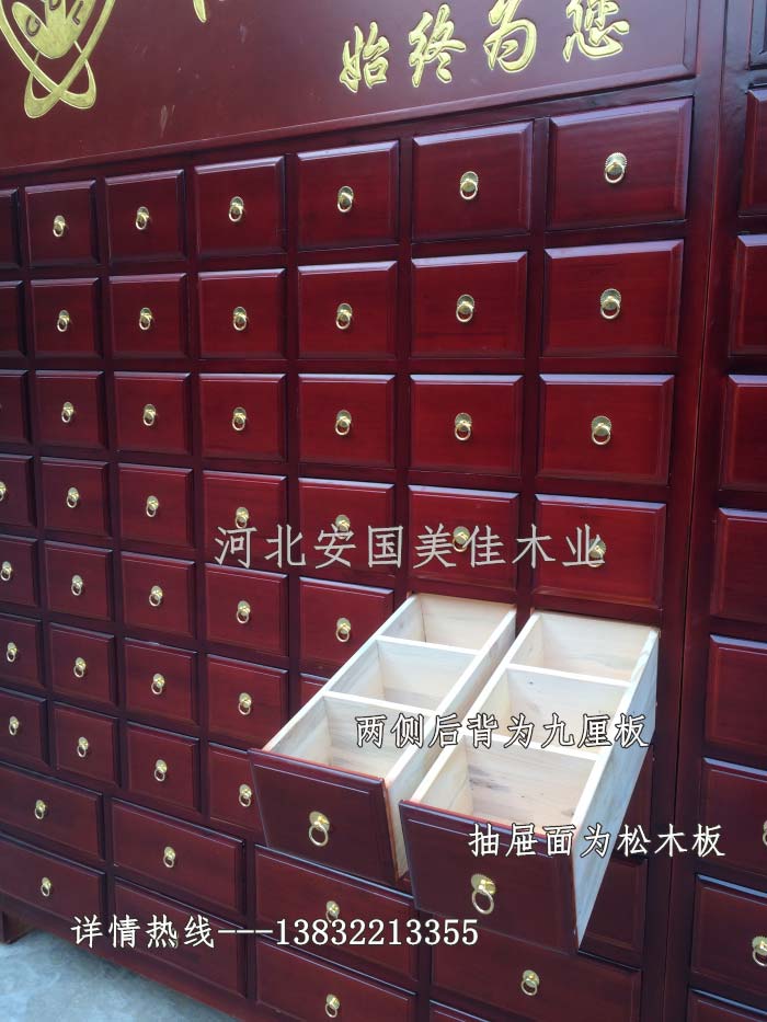 中藥柜尺寸---高240公分,寬170公分,厚60公分。抽屜面尺寸:寬18公分,高19公分。厚度17公分。中藥柜用料---框架和抽屜選用優質樟松木,抽屜下面有五合板封底,防串味,抽屜底選用七合板,中藥柜的后背兩側頂部選用九厘板。抽屜面為松木整塊板。中藥柜款式---橫七豎九款。橫著七個抽屜,豎著七層抽屜,較下面為兩排大抽屜,每個抽屜兩味藥,每個中藥柜可以裝163味藥。中藥柜顏色---經典仿紅木色花紋烤漆。中藥柜用漆---亮光或者半啞環保聚脂漆水房烤漆。中藥柜拉環---超精致純銅拉環。