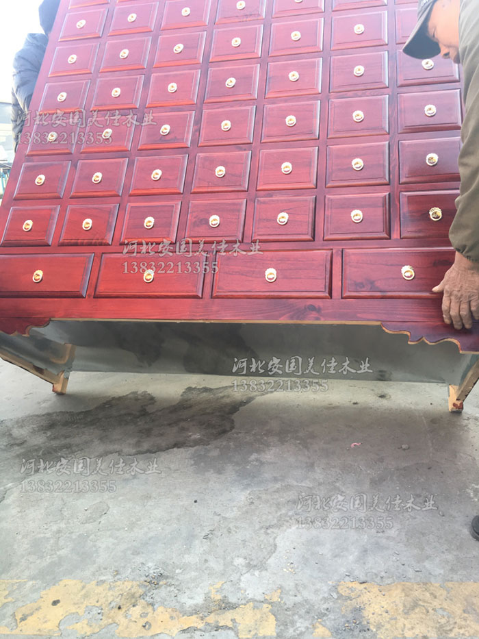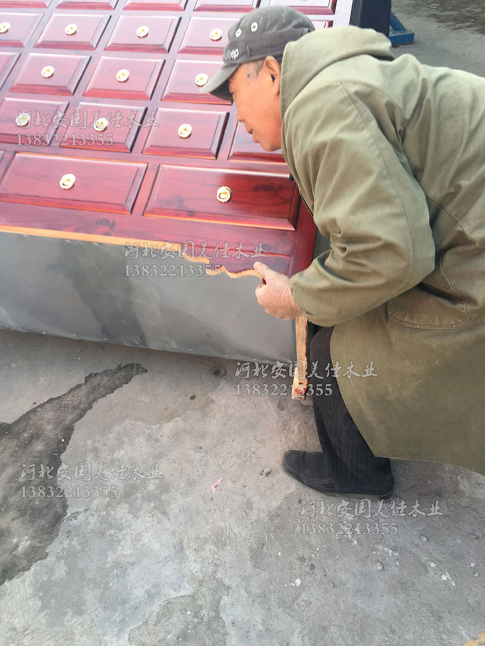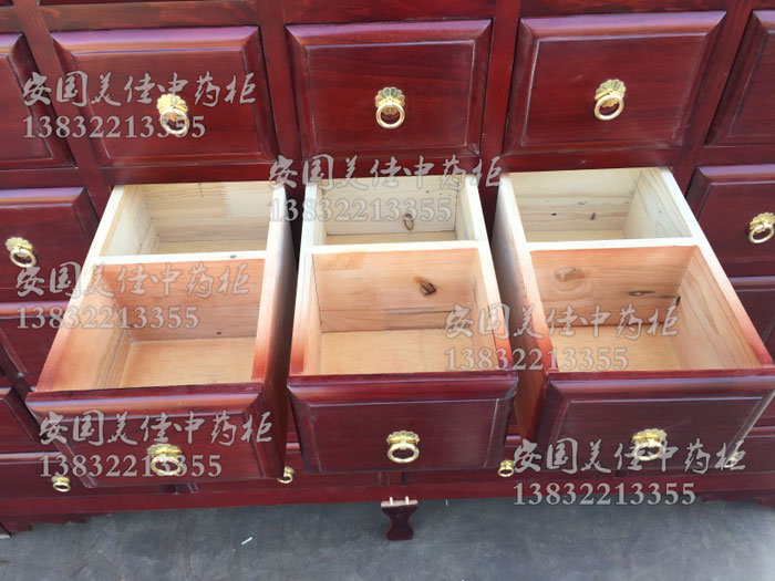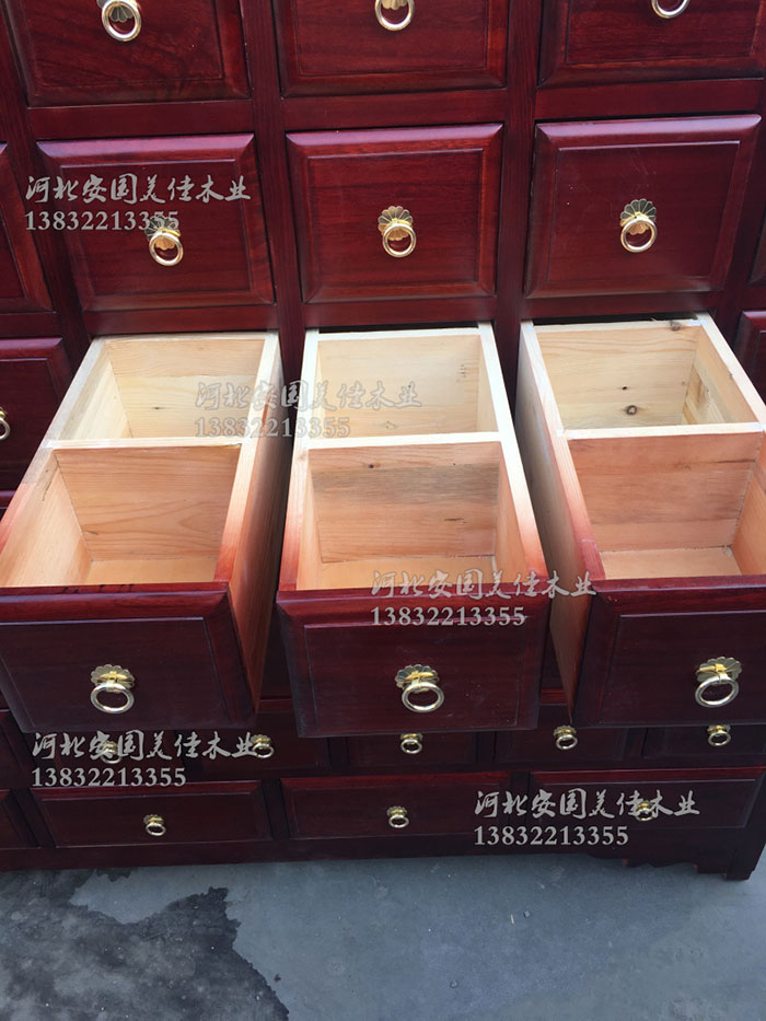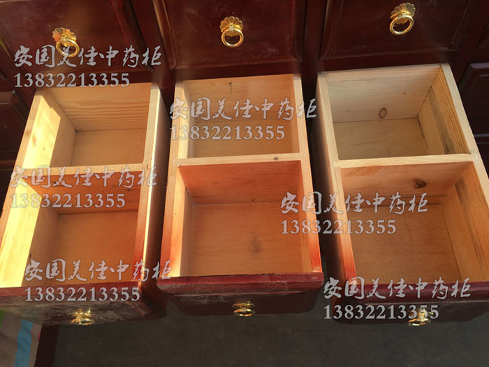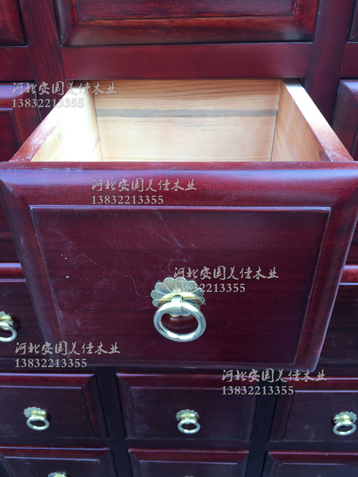 中藥柜用料---框架和抽屜選用優(yōu)質(zhì)樟松木,抽屜下面有五合板封底,防串味,抽屜底選用七合板,中藥柜的后背兩側(cè)頂部選用七合板。